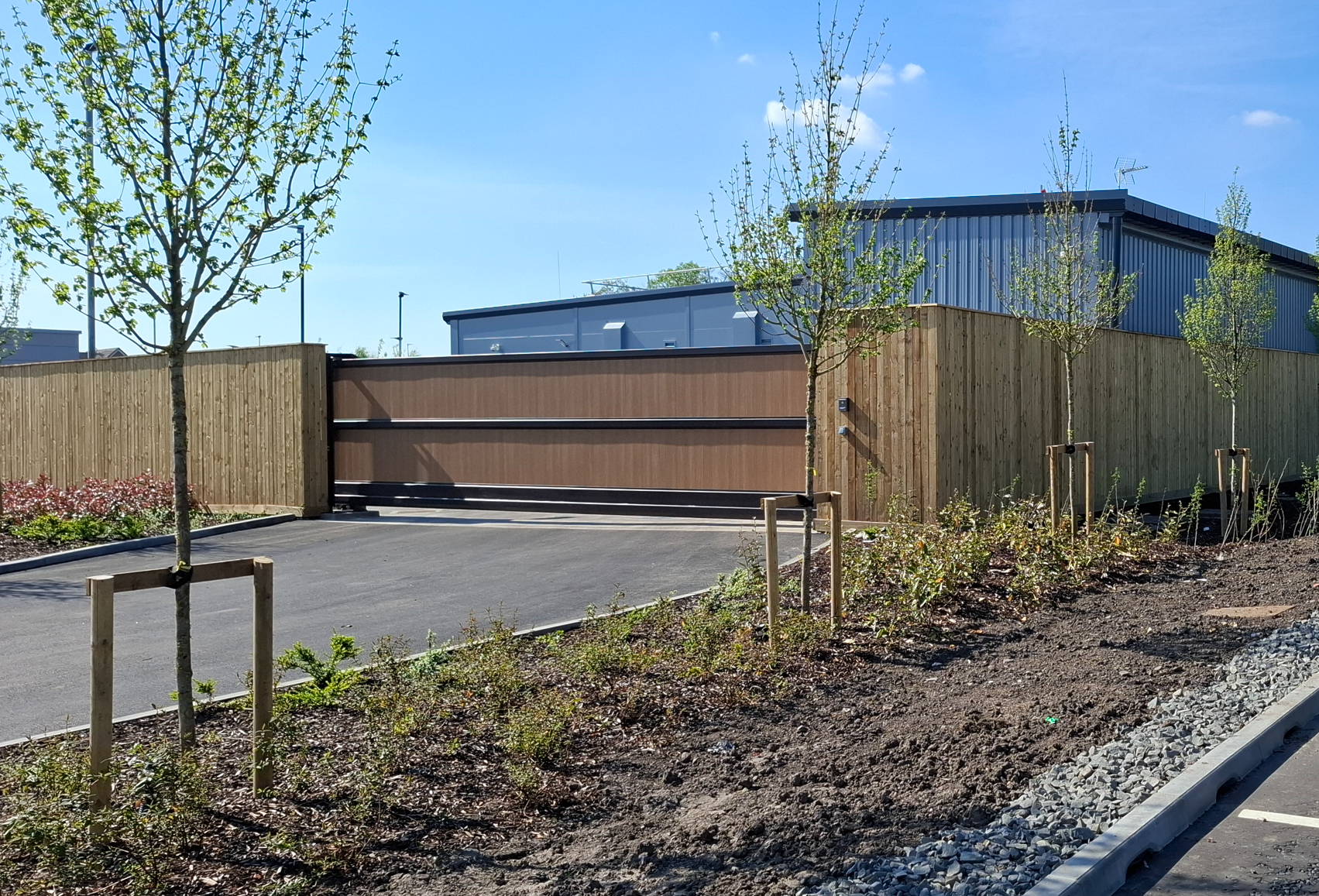 A single FBS5800 automated cantilever gate, measuring 9000mm by 2700mm, was installed at the entrance, featuring composite timber-effect tongue and groove infill panels for enhanced aesthetics. Meeting full safety compliance with BS EN 12453 standards, it features twin photocells, CAT3 safety edges, an emergency stop button, and a flashing beacon. It is powder-coated in RAL 9005 (black). Whilst a FBS6000 manual double-leaf swing gate, sized at 7500mm by 1900mm, was installed at the exit. This gate includes timber-effect infill and black powder-coated finish and a slip latch and drop bolts for secure manual operation.